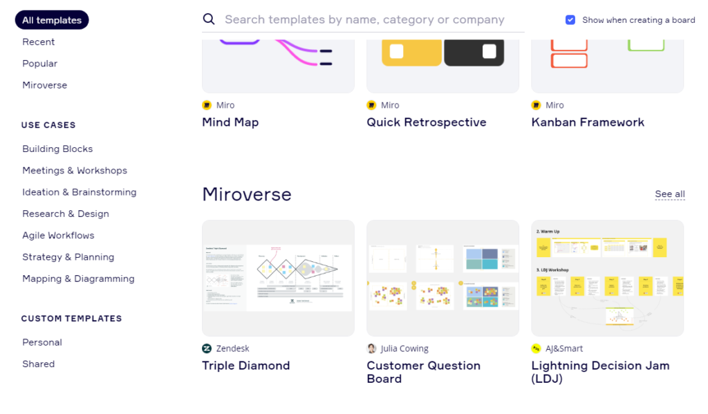 Templates. When you can’t think of it yourself someone on Miro might have. There are oodles of templates to start with.